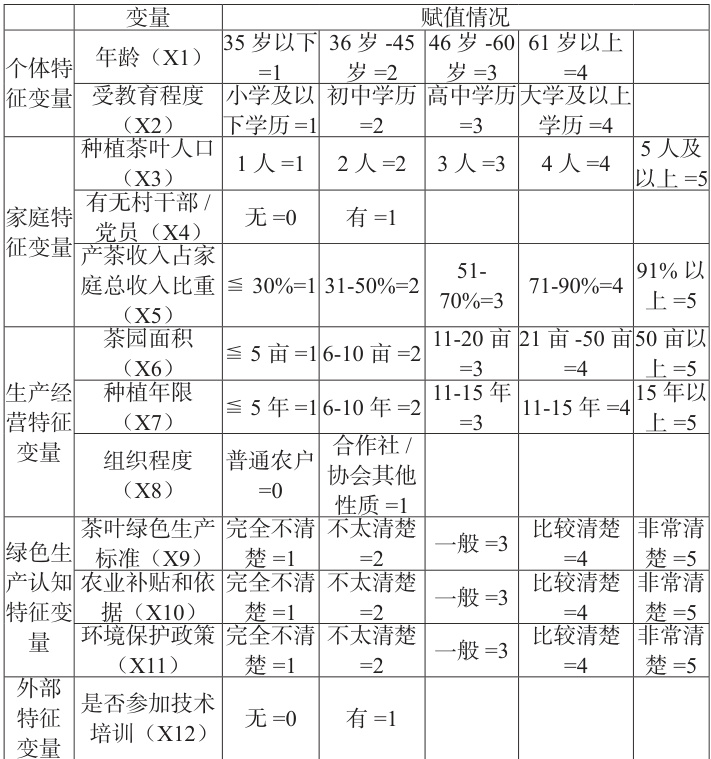 表1 茶农绿色生产行为实证模型自变量选取与赋值