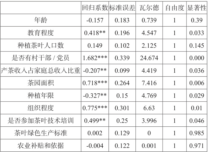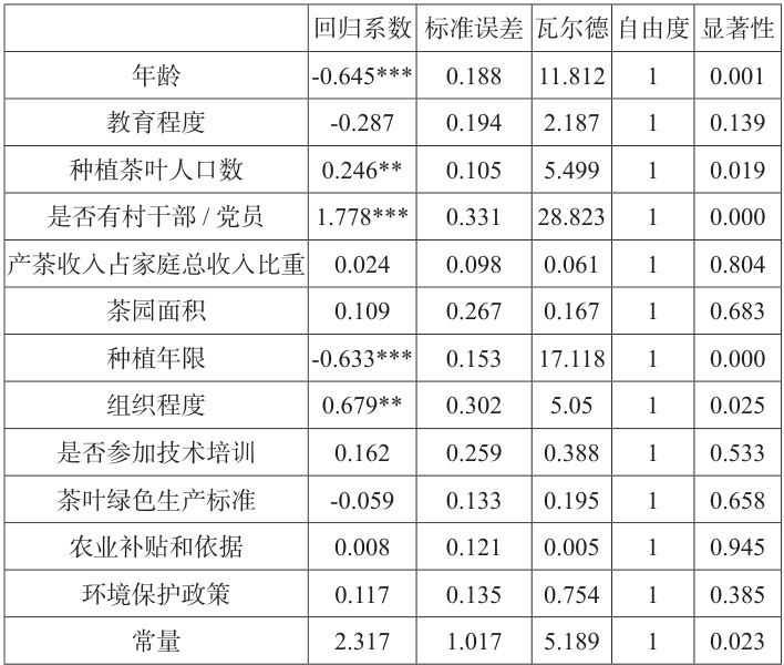 从以上表格分析可得:受教育程度高的茶农更易接受生物防控技术;家庭有村干部 / 党员、加入合作社的茶农,因政策了解多、受监督,更倾向采用;茶园面积大的茶农易获补贴与培训,采用意愿高;种植年限长的茶农依赖传统经验,接受度低;产茶收入占比高的茶农更关注短期产量,倾向化学防控。
