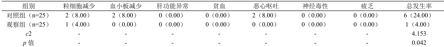 评估两组不良反应发生情况,包括粒细胞减少、血小板减少、贫血、肝功能异常、恶心呕吐、神经毒性、疲乏。