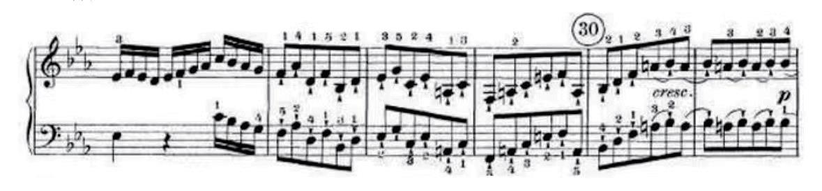 这儿的一些双手断奏在演奏的时候,我们要注意指尖的力量得往下落,虽然是断奏,但要让整个音色沉下去,不能是虚无缥缈的。不要在弹奏的时候去拖延时常,不能拖泥带水重音在B 上,但是这个音不能过于僵硬处理,前面的断奏将要弹奏出渐强的感觉来衔接好这个段落。第31 小节出现了渐强(cresc.),第32 小节出现了轻(p)。所以要衔接的非常连贯且自然。在弹这些断奏的时候,手型也得保持住,用身体的力量推动旋律往上进行。