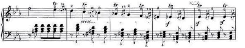 呈示部回归 E 大调,四个小节左右手声部呼应,灵活的颤音将调性解决到主调。整个过程精妙地运用了短小带有戏剧性的成效。这一段落给人带来震惊、野性、无法控制的幽默。