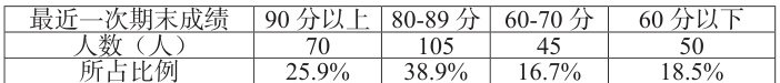 从上表中可知,成绩在 90 分以上的有 70 人,占参与调查总数的 25.9% ;成绩在 80-89 分区间的有 105 人,占参与调查总数的38.9% ,成绩在 70-79 分区间的有 45 人,占参与调查总数的 18.5% ,大部分学生基础一般,学习能力一般。