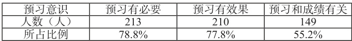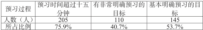 从上表中很直观地看到,预习时间超过 15 分钟以上的学生有205 人,占总人数的 75.9% ,大部分学生的预习时间充分; 40.7% 的学生有非常明确预习的目标, 53.7% 的学生有基本明确预习的目标,有预习目标的学生人数有 263 人,占总人数的 97.5% ,学生心中是有都有自己的预习的标准,是大致知道怎么样去预习的。