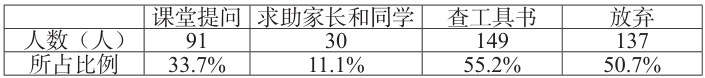 课堂提问的学生有 91 人,占总人数的 33.7% ,占总人数的三分之一,而求助家长和同学的人数仅为 11.1% ,家长和同学帮助都利用不起来。而查工具书上网查资料的人有 55.2% ,不过偏向工具书,由于家长们对孩子手机管控比较严格,限制其用电子产品的时间,令人意外的是放弃的人数竟然高达半数。可见同学们严重缺乏解决问题意识,自己不会,也不愿意去求助他人。