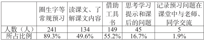为了解本校小学生语文预习现状,笔者采用问卷调查的方式本校的中高段的小学生和 12 位语文进行了调查。学生调查对象为学校的小学三、四、五、六年级的全体学生。针对学生的调查问卷共发出 280 份,收回问卷 280 份,其中有效问卷 270 份。学生问卷调查调查了学生对语文预习的认识和习惯、语文预习的方法、预习结果的检查评价等几方面。教师问卷内容则从学生的预习习惯、能力表现、教师指导预习的方法、意识,还有家校配合等方面调查。通过对问卷调查的数据统计和分析,发现本校中高年级语文预习现状存在以下几个问题。