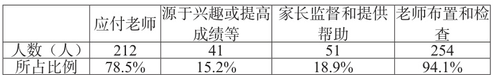 从上表中可知仅有 15.2% 预习是自身想要预习,大部分是为了应付老师。家长提供的帮助有限。学生完成预习作业存在兴趣不足、质量不高的问题。问卷调查反映出,在预习习惯养成上,学生缺少家长的有效监督,在预习习惯养成方面不理想。