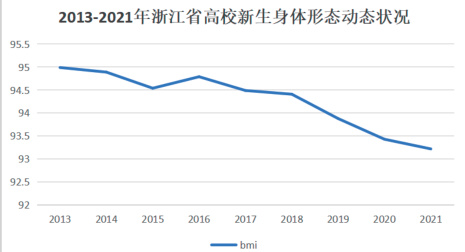 通过图 2-1 可知,在 2013-2021 年期间,浙江省高校新生 bmi虽然保持在 90 分以上的优良成绩,但是 bmi 得分在逐年降低由一开始 94.99 逐步下降到 93.2,最值得关注的是 2018 年后 bmi 下降趋势远比 2013 年 -2017 年下降幅度要大,从千分之五上 升至百分之一,这个下降趋势与第八次全国学生健康调研趋势相同,在高校学生中肥胖率,超重率逐渐上升。BMI 上升的原因是多种多样的 ,一方面电子娱乐工具频出,学生体力活动明显减少,养成了久坐不动的生活习惯,其次,学生学业压力逐渐增大,青少年活动时间减少,运动时间得不到保证。