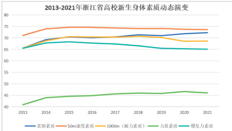 大学生是新时代的主力军,是国家富强、民族振兴的人力资源基础。我国青少年身体素质发展一直是社会聚焦的重要议题,青少年的身体素质代表着我国青少年综合实力发展程度。健康的体质不仅是学生个人综合素质发展的基础,也是引导学校深化体育教学改革的重要依据,还是判断和预测一个国家国民素质和经济社会发展的重要依据之一。为此,我国政府相继出台了《关于强化学校体育促进学生身心健康全面发展的意见》等一系列的政策文件,旨在有效缓解近年来我国大学生身体体质健康水平逐年下降的趋势。浙江省作为我国经济发展领先地区,浙江省青少年身体素质水平代表了中国青少年身体素质发展的较高水平。对浙江省青少年身体素质变化进行研究有利于探究近十年来中小学体育教育改革下青少年身体素质发展方向,为高校进行体育教育提供指导性依据,也为中小学体育教育提供改革意见。本文以浙江省 2013-2021 年高校新生体质健康抽测数据为基础,探究近十年来浙江省高校新生的身体素质变化情况。
