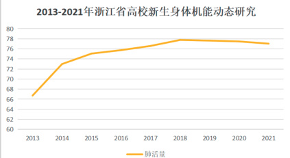 为认真贯彻中共中央、国务院以及省委、省政府相关文件精神,进一步加强浙江省青少年体育工作,增强青少年体质、促进青少年健康成长,浙江省教育厅从 2007 年开始,对进入全省高校的大学一年级新生进行了体质健康测试。高校新生体质健康测试从最初的18 所学校,49154 名学生到 2021102 所学校 236653 名学生,体质健康测试的范围与数量得到了长足的进步。教育部在 2014 年颁布了《国家学生体质健康标准》,适用于全日制普通小学至高校学生,旨在通过体质监测评价提升青少年健康水平。《国家学生体质健康标准》从身体形态、身体机能和身体素质等方面综合评定学生的体质健康水平,是促进学生体质健康发展、激励学生积极进行身体锻炼的教育手段,是国家学生发展核心素养体系和学业质量标准的重要组成部分,是学生体质健康的个体评价标准。《国家学生体质健康标准》通过肺活量衡量学生身体机能的发展,通过 50m,1000m ,立定跳远,坐位体前屈,引体向上 / 仰卧起坐全面反应青少年身体素质发展情况,BMI 则能够良好反应学生身体形态,对学生肥胖率进行收集。《国家学生体质健康标准》(2014 年修订版)与 2002 年颁布版本有评分标准,测试项目的差别,2013 年以前的数据未有良好的参考性。因此,我们采用 2013 年 -2021 年的高校新生体质健康数据。