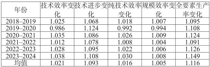 为进一步分析效率动态变化,使用 Malmquist 指数模型对2018-2024 年冷链物流全要素生产率变化进行分解,结果如表 3-3所示。
