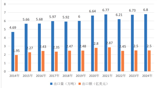 从出口茶叶品牌来看,安徽省已形成一批在国内具有较高市场认知度的茶叶品牌,包括霍山黄牙、黄山毛峰、祁门红茶、太平猴魁、六安瓜片等。茶叶的种类包括乌龙茶、绿茶、花茶、红茶等多个类别,以其独特风味和优良的品质赢得了国内外消费者的喜爱与认可。其中,绿茶是出口贸易中主要的品种,绿茶产量在整个茶叶生产中的比重稳定在 90% 左右,主要出口至非洲及亚洲等地区,其未来的发展潜力较大。从整体来看安徽茶叶在近十年的出口情况相对是比较可观的。从图 1 可以看出,安徽省茶叶出口量和出口额呈持续增长趋势,出口额从 2014 年的 1.95 亿美元增至 2024 年的 2.5 亿美元;出口量从 2014 年的 4.69 万吨上增至 2024 年的 6.8 万吨,且自2019 年起均保持在 6 万吨以上。但自 2021 年起,安徽省茶叶出口出现了一定程度的下滑,这与新冠疫情的出现有很大的关系。