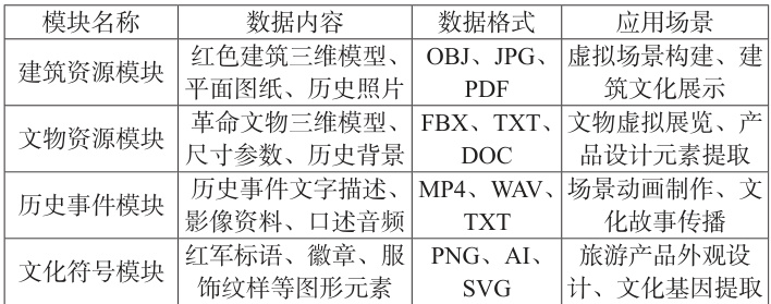 构建福建红色文化资源数据库,采用MySQL 数据库管理系统,分为四个数据模块(如表1 所示),数据库支持Web 端与移动端访问,用户可通过关键词检索所需资源,查看三维模型的旋转、缩放效果,下载设计所需的图形元素,实现资源的高效复用。