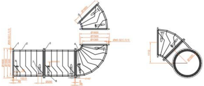 弘盛铜业阳极精炼工序配有2 台680 吨回转式阳极炉,炉体直径 5m ,长度 14.5m 。阳极炉烟气依次经水冷烟罩、烟道、遥感清灰装置、阳极炉布袋及风机,烟道全段采用钢爪+浇注料形式。自2022 年10 月投产以来,阳极炉烟道有部分支撑变形,管道下沉,且伴有耐火材料脱落的情况,导致管道钢壳直接与高温烟气接触而漏火。为不影响生产的正常进行,通过加固管道支撑、挖补破损处、清理烟道内部掉落的耐火材料等方式对烟道进行临时处理,但临时处理的烟道约30 天就会再次出现破损的情况,效果不佳。为此,在2023 年7 月份,对2#阳极炉烟道进行了部分更换。在2023年8 月份,对1#阳极炉的烟道进行了部分更换。对部分烟道进行更换后仍不能保证长时间使用,同时浇注料坍塌,导致烟道堵塞,极大的影响负压,不利于生产正常运行。故在2024 年4 月中修期间,对阳极炉烟道进一步优化改造。
