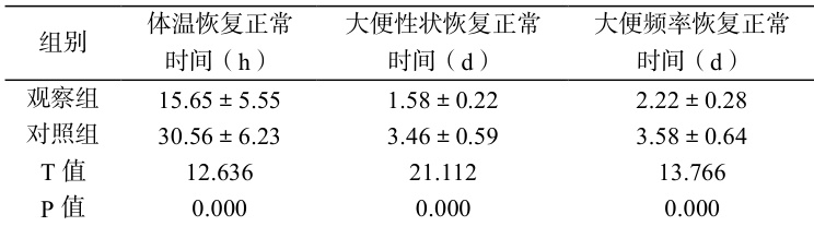 由表 2 可知:观察组体温恢复正常时间、大便性状恢复正常时间、大便频率恢复正常时间均短于对照组, P<0.05 。