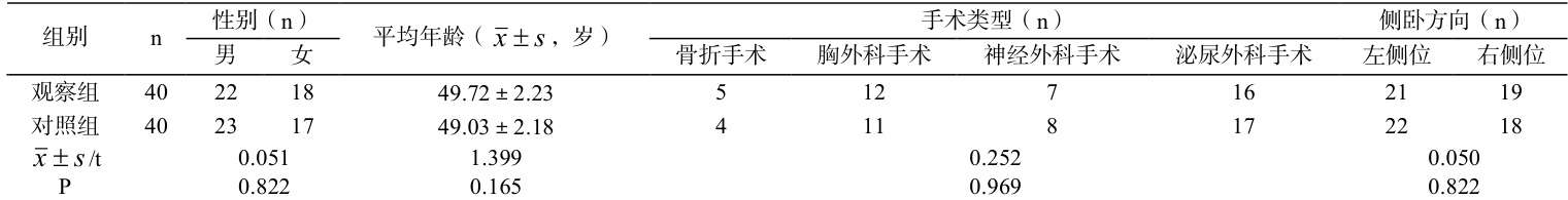 本次的研究对象为 2024 年 1 月至 2024 年 12 月收治的 80 例手术治疗患者,所有患者的手术体位均为侧卧位。在征得患者及其家属的同意下将所有患者进行分组, n=40 。两组患者性别、年龄、手术类型及侧卧方向等一般资料间经过对比分析显示差异不显著( P>0.05 ),具有可比性。具体的对比数据见表 1。