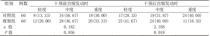 表1 干预前后宫缩发动时对照组和观察组产妇疼痛等级比较 单位:例(%)