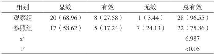 观察组治疗总有效率高于参照组(P<0.05),见表2。