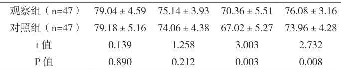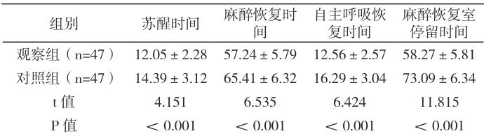 2.4 两组老年脊柱骨折患者麻醉后的恢复时间观察组更短( P<0.05. ),见表5。