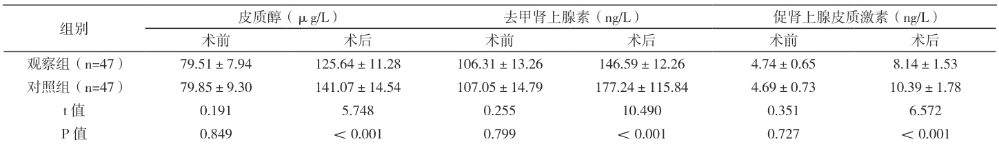 2.5 两组老年脊柱骨折患者的应激指标术后,观察组的各项应急指标更低( P<0.05 ),见表 6