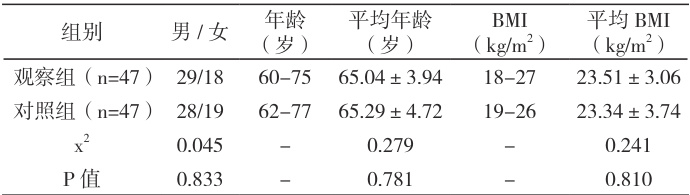 选取2024 年12 月\~2025 年6 月本院收治的94 例老年脊柱骨折患者的基本资料见表1。纳入标准:(1)符合脊柱骨折诊断标准。(2)符合手术适应证。(3)ASA 麻醉分级Ⅰ\~ Ⅲ级。排除标准:(1)资料不完整。(2)对本研究使用的各类麻醉药物过敏。(3)合并其他骨折。