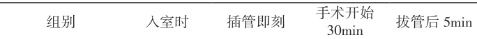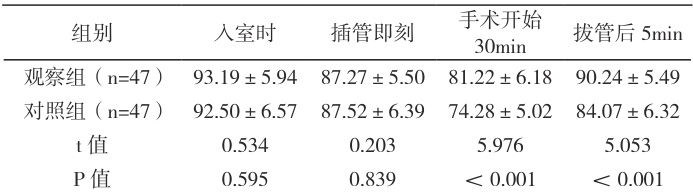 两组入室时、插管即刻的心率水平相近 (P>0.05 ),观察组在手术开始 30min、拔管后 5min 的水平更高 P<0.05 ),见表2。