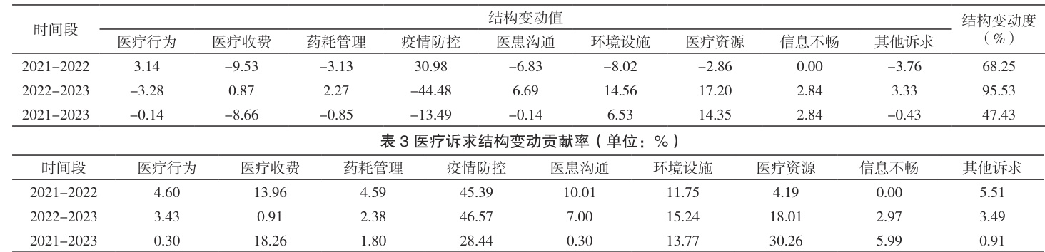 ,结构变动贡献率 =|Xil-Xi0|/DSV×100% ,i代表医疗诉求类型序列号, Xi0 表示期初诉求占比, Xil 表示期末诉求占比。结构变动值 >0 表明占比上升,反之下降。