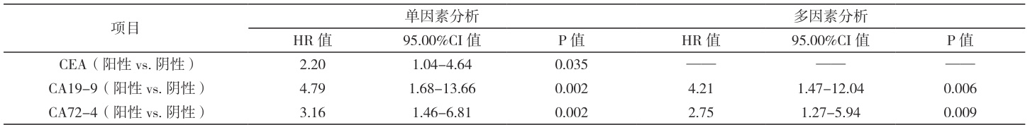 单因素分析证实,肿瘤标志物 CEA、CA19-9、CA72-4 与晚期结肠癌患者的生存期相关( P<0.05 )。多因素分析证实,CA19-9、CA72-4 与晚期结肠癌患者的生存期相关( P<0.05 )。详情参见表1 :