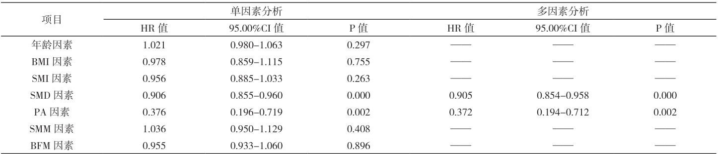 单因素分析证实,低 PA 值患者生存期短于高值患者( P<0.05 )。低 SMD 值患者的生存期短于高值患者( P<0.05 )。多因素分析证实,PA 因素、SMD 因素是患者生存期的独立危险因素( P<0.05) 。