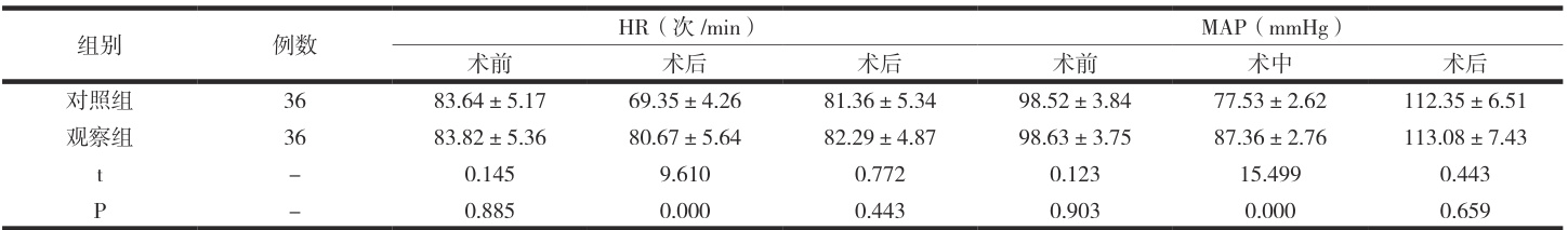 两组 HR、MAP 于术中和术后比较( P>0.05 );术中,观察组HR、MAP 高于对照组( P<0.05 )。见表1 :