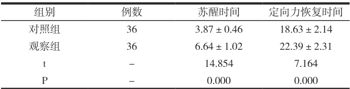 表2 苏醒与定向力恢复时间对比(min,