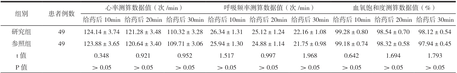 2023 年 2 月 -2025 年 1 月,将 98 例小儿麻醉患者随机分两组,各 49 例。参照组男性 32 例,女性 17 例,年龄介于 1-9 岁,平均( 3.98±0.28 )岁,体重介于 14-31kg ,平均( 19.44±3.30 ) kg 。研究组男性 33 例,女性 16 例,年龄介于 2-10 岁,平均( 3.96±0.26 )岁,体重介于 15-32kg ,平均( 19.42±3.27 ) kg 。两组的基线资料未见差异( ΔP>0.05 )。