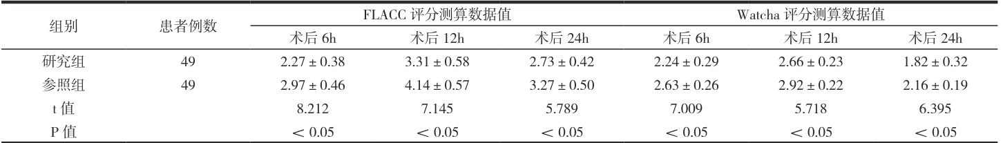 表3 两组在不同时刻的 FLACC 评分测算数据值以及Watcha 评分测算数据值比较(