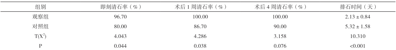 观察组术后即刻清石率,术后 1 周清石率均高于对照组( P<0.05 ),见表1。