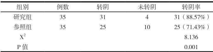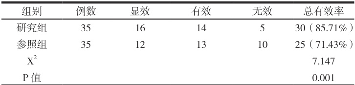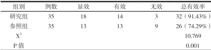 患者接受治疗后根据症状情况进行临床效果的评估,分为显效、有效和无效三个层次;治疗后患者的临床症状完全消失为显效;治疗后患者的临床症状明显缓解为有效;治疗后患者的临床症状无改善为无效;总有效率 Ψ=Ψ (显效 + 有效)/35 例 ×100%. 。