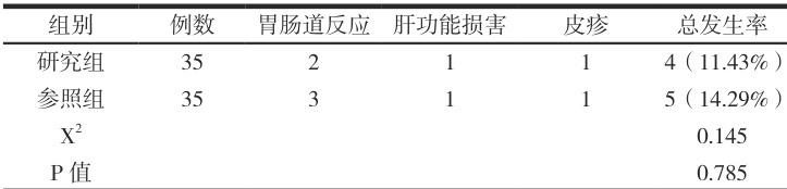 胃肠道反应、肝功能损害和皮疹是患者接受治疗过程中常见的不良反应现象,记录发生类型和记录发生次数,并计算所占比例,进行组间对比。