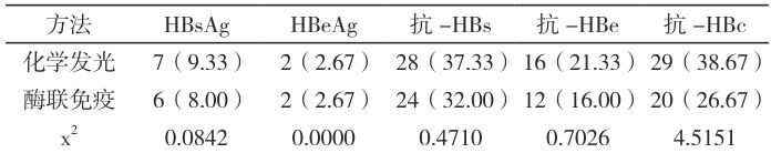 化学发光免疫分析法抗 -HBc 阳性检出率显著更高, p<0.05 ,其余无显著差异( p>0.05 ),见表1。