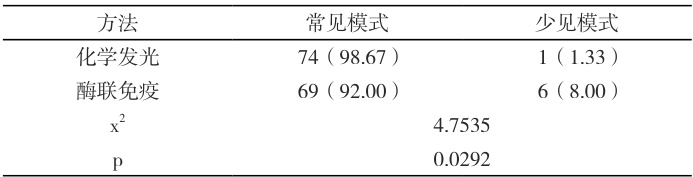 化学发光免疫分析法两对半常见模式阳性检出率显著更高,p<0.05 ,见表 2。