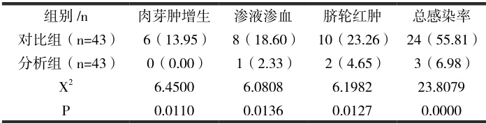 肉芽肿增生、渗液渗血、脐轮红肿发生率及总感染率比较分析组均低于对比组, P<0.05 。见下表: