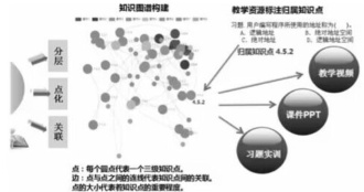 将课程的知识体系化 , 构建多维度下的知识图谱(如图 5 所示)。依据课程的自有知识体系与结构,在系统性层次性的原则下划分知识点 ( 三层 : 章、节、点 ), 匹配于课程教学的章节体系来完成知识点的分割、标注。随后组建专家组进行审定、修改与定稿, 确定知识点的重要度、两点之间的关联度与前趋关系,并构建关联图与前趋图等。