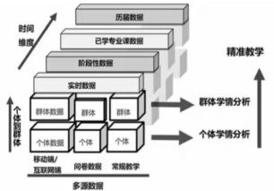 信息技术与教育教学全过程的有机融合 了种类繁 构相异的多维数据 , 不同类型的数据蕴含学生的某一方面特性。如图 数据用于识别个性 ; 静态历史数据( 学生基本情况、往届成绩等 时数据 ( 移动端、互联网等 ) 表达出微观个体的知识点掌握实情 , 有效学习时间、在线单元测试等 )揭示了学生阶段性学习研究、 心理倾向与人生目标等 , 与学习内生动力紧密相联, 教师可针对需求、 点亮课程思 指引与激励学生前行