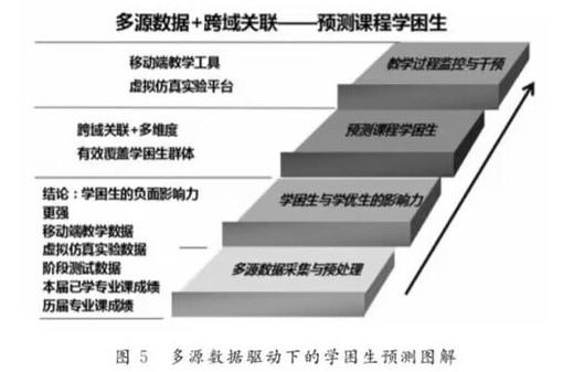 以多源数据为基础, 通过跨域关联与分析, 有效识别与预测学情数据对应用教学具有现实意义。以预测学困生为例, 首先采集多维数据, 并从往届历史数据中发现学困生对同寝室学生的影响更大( 与学优生相比 )。进一步 , 对移动端教学数据、在线实验数据、阶段测试数据及历史成绩等多个维度开展跨域关联与多维数据分析 , 进行课程学业预警 , 在随后的教学实践中对学困生这一群体进行重点监控与及时干预,如下图2 所示。