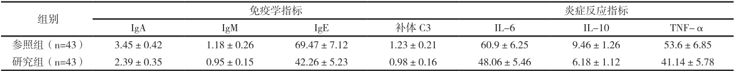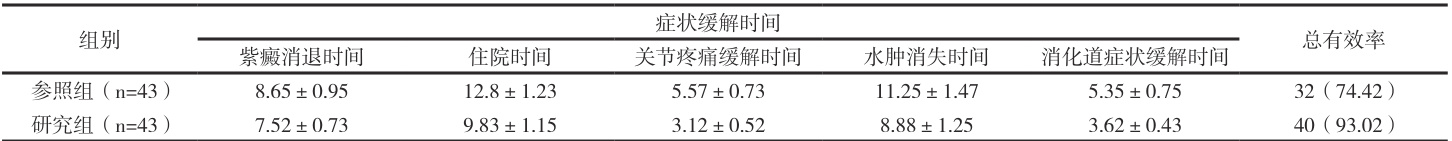 设立 2020 年 10 月至 2024 年 10 月为研讨期限,纳入 86 例小儿过敏性紫癜患儿为研究对象,遵循“知情同意原则”,采用数字编号法进行组别划分,每组归入( 1=43 )。细化资料如下:参照组:男女占比24:19 ,年龄均值( 6.89±1.43 )岁。研究组:男女占比 25:18 ,年龄均值( 6.72±1.54 )岁。基线资料 P>0.05, 。