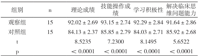 观察组实习生各项考核成绩明显优于对照组,差异具有统计学意义( p<0.05 ),详见表1 :
