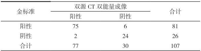 双源 CT 双能量成像对痛风性关节炎的诊断准确率、灵敏度以及特异度数值分别为 92.5% , 94.7% , 88.9% ,表 1。