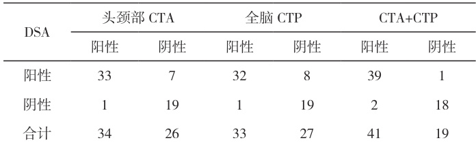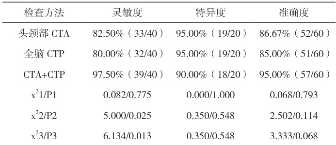 97.50%、特异度为 90.00%、准确度为 95.00%。CTA+CTP 诊断 AIS 的灵敏度高于单独头颈部 CTA 与单独全脑 CTP,差异具有统计学