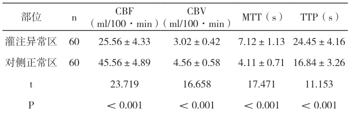 注:x21/P1 表示头颈部 CTA 与全脑 CTP 比较;x22/P2 表示头颈部 CTA 与 CTA+CTP 比较;x23/P3 表示全脑 CTP 与 CTA+CTP 比较。2.2 CTP 参数对比接受检查的疑似病患,灌注异常区的CTP 参数指标CBF、CBV 均低于对侧正常区,而灌注异常区MTT、TTP 均高于对侧正常区,组间差异均有统计意义 (P<0.05) ,见表3。
