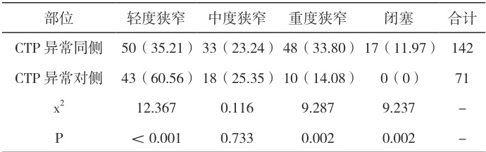 2.3 CTA 检查结果60 例 AIS 患者,共计检出 142 个动脉斑块,其中椎动脉 51 个,基底动脉 50 个,颈动脉 41 ℏs CTP 异常同侧动脉狭窄程度高于CTP 异常对侧,对比差异具有统计学意义(P <0.05),见表4。表4 头颈部CTA 检查结果