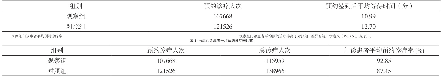 观察组门诊患者预约签到后平均等待时间低于对照组, 差异有统计学意义(P<0.05)。见