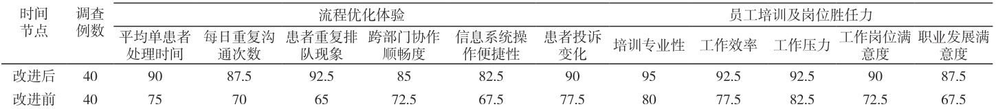 查。发放针对本次科研拟定的“门诊一站式服务患者满意度调查问卷”评价患者满意度。医护人员对KTQ一站式服务流程优化的满意度:发放针对本次科研拟定的“门诊一站式服务流程优化员工调查问卷”进行评价。1.4 统计学方法