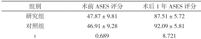 修复手术前,所有患者的 ASES 评分对比,没有明显差异性,P>0.05,无统计价值。修复后 1 年,两组患者的ASES 评分均有所提升,尤其是研究组患者的ASES 评分提升幅度更大,与修复后的对照组比较,P<0.05,差异存在统计价值,详细数据如表2 所示。